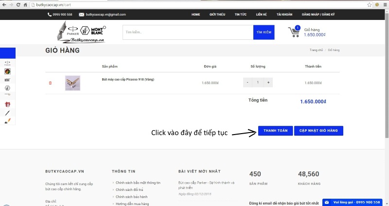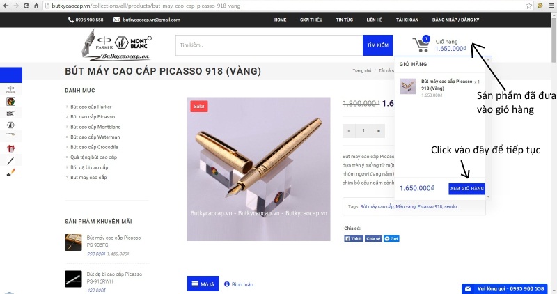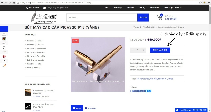 2. Đặt hàng qua Website: Quý khách truy cập vào website butkycaocap.vn, xem sản phẩm theo danh mục sản phẩm, lựa chọn loại bút cần mua, nhấn vào THÊM VÀO GIỎ. Sản phẩm Quý khách muốn mua sẽ được đưa vào giỏ hàng, Quý khách có thể thêm nhiều sản phẩm vào cùng 1 giỏ hàng nếu muốn đặt nhiều sản phẩm.