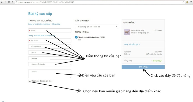 Quý khách điền thông tin cần thiết vào khung THÔNG TIN MUA HÀNG. Sau khi điền song Quý khách chọn ĐẶT HÀNG